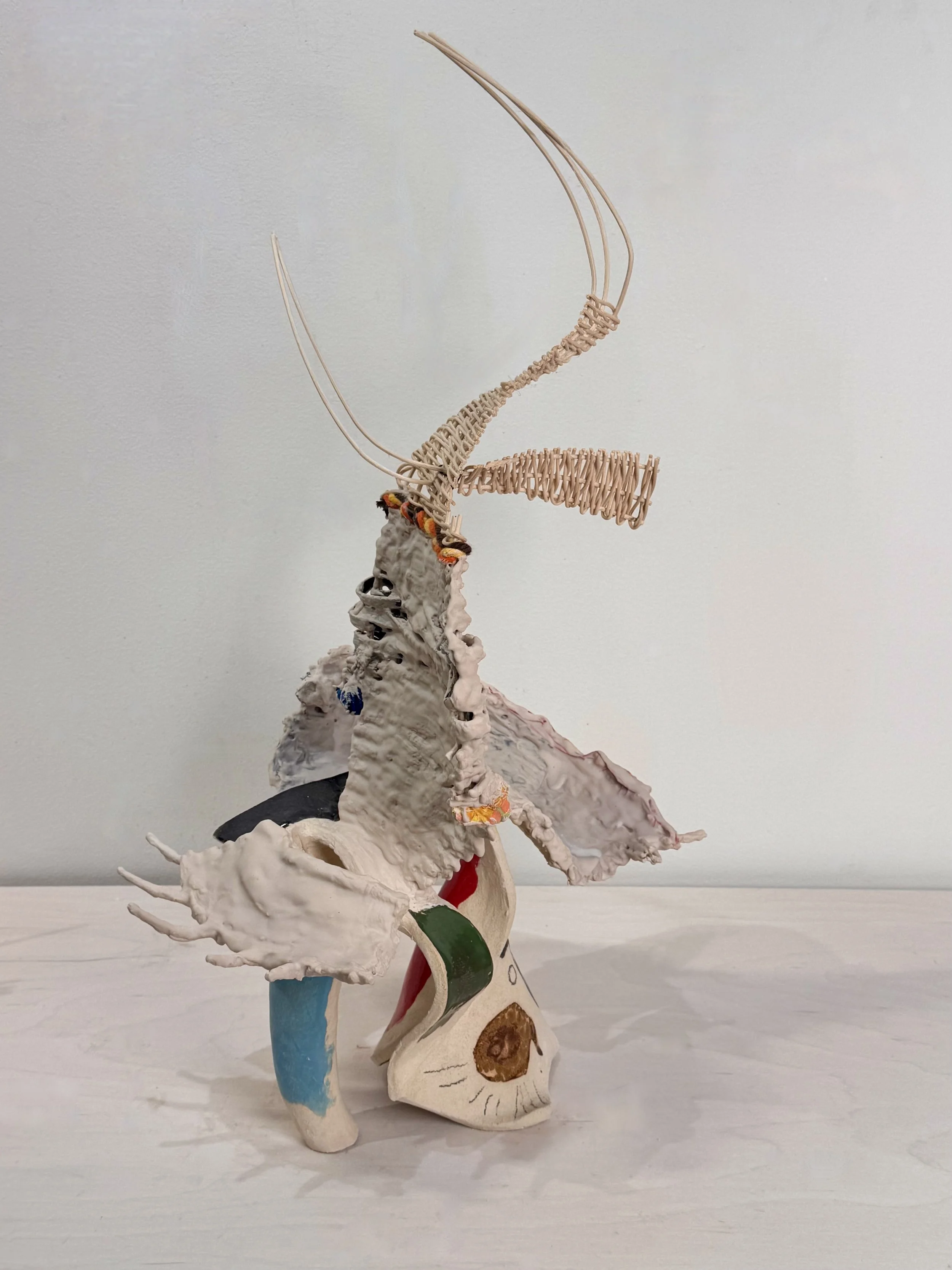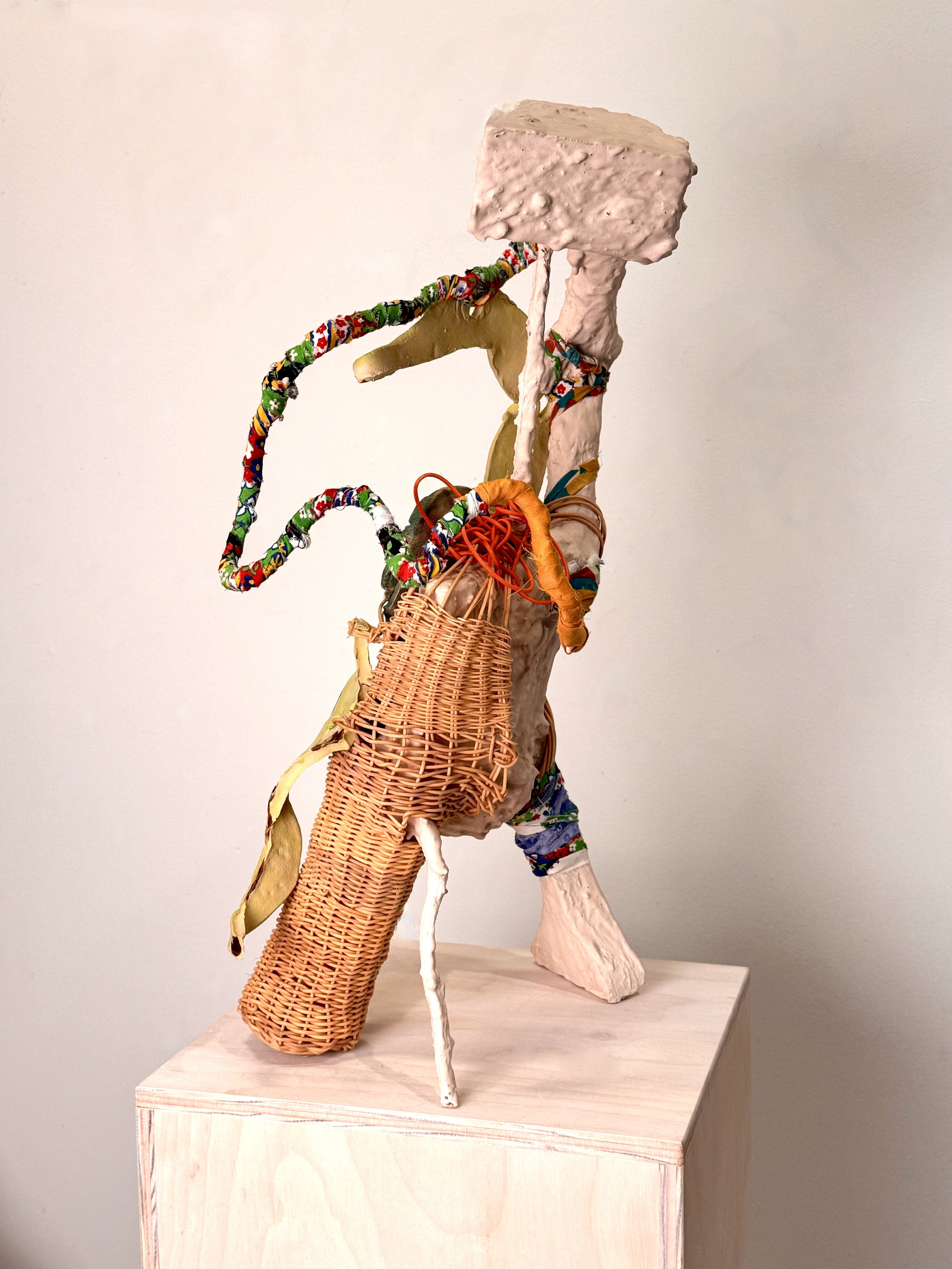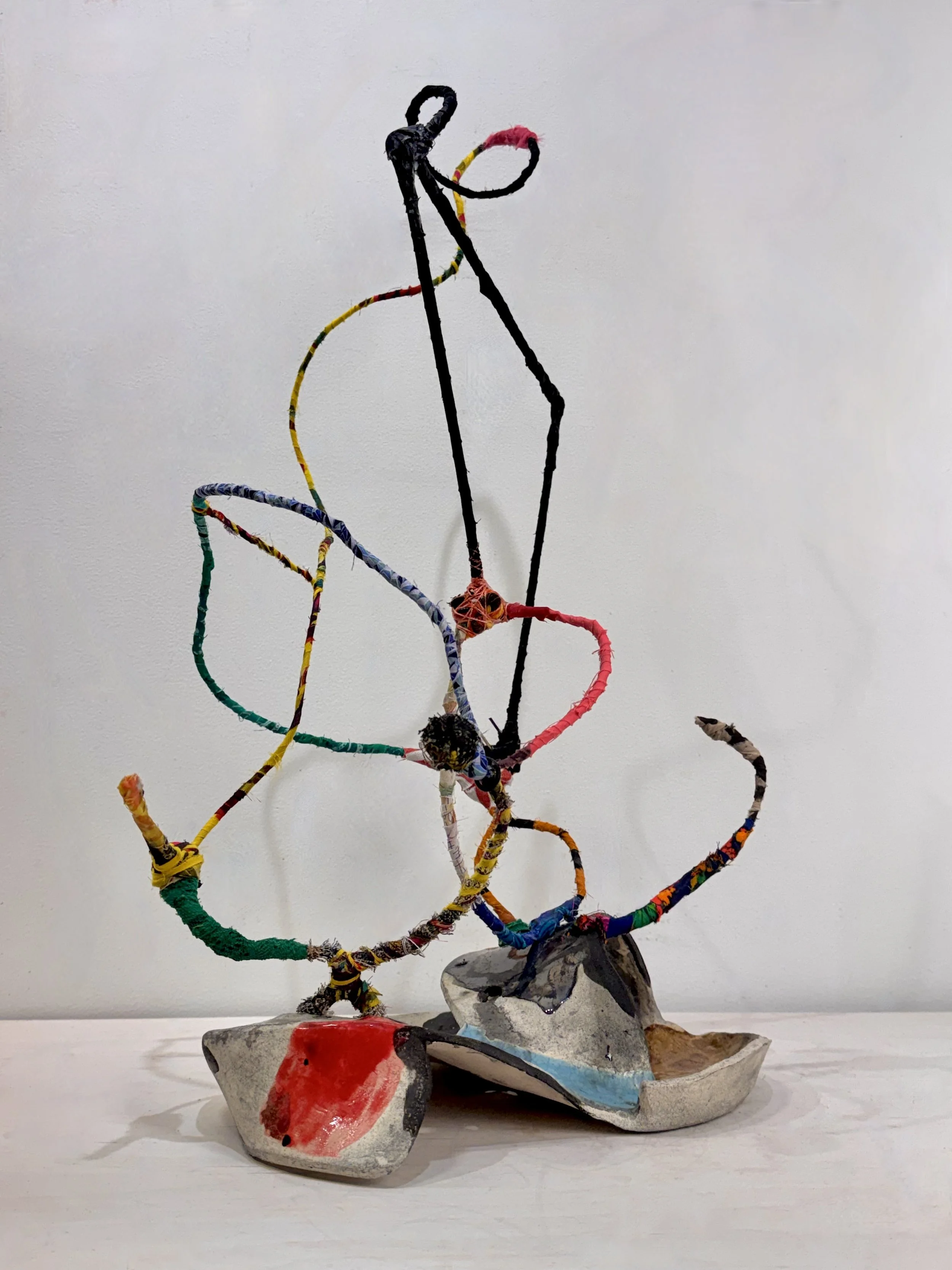 “Ways and Means”, 2025, 25” x 14” x 11” , Ceramic, fabric, wire, wood, paint.