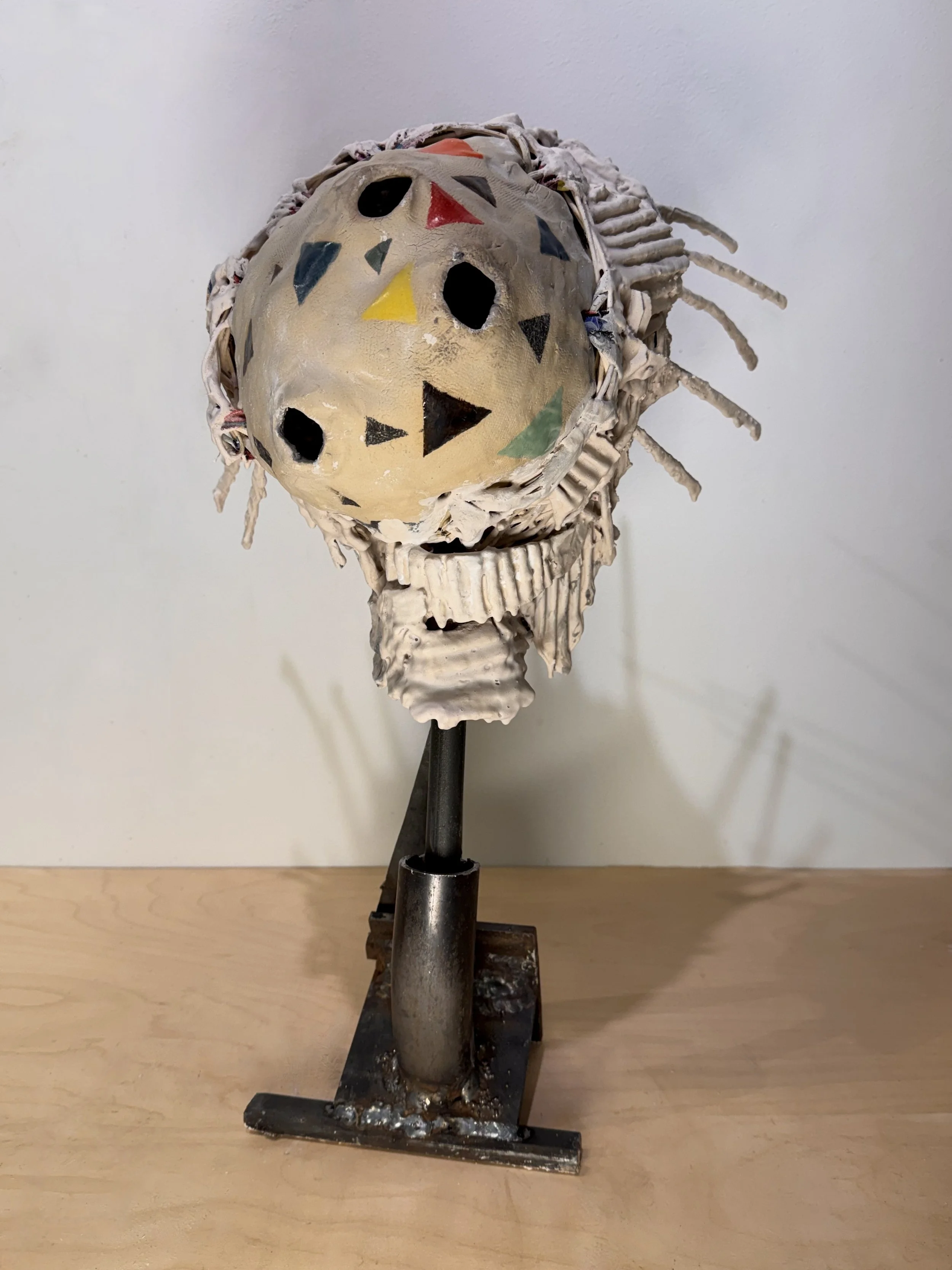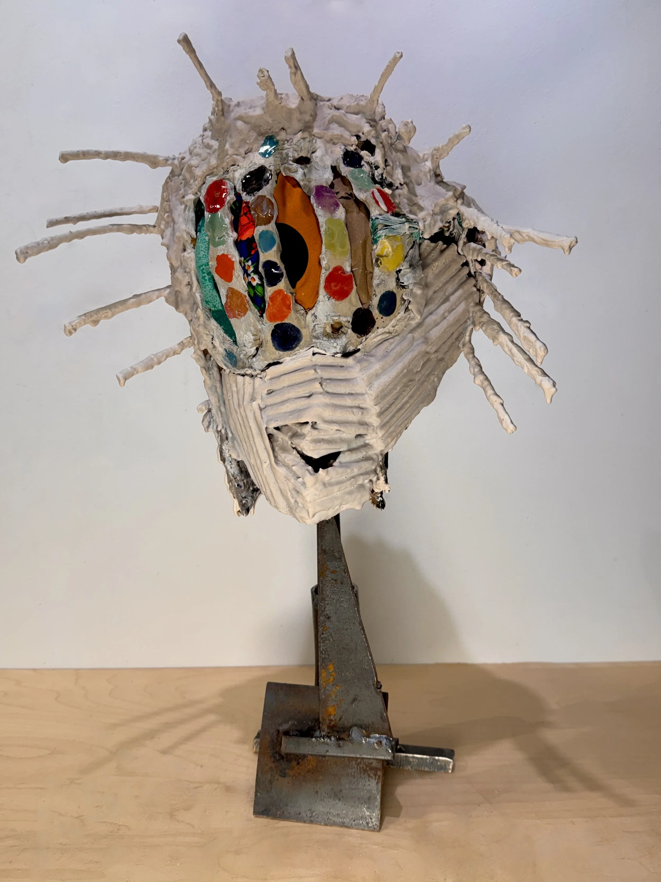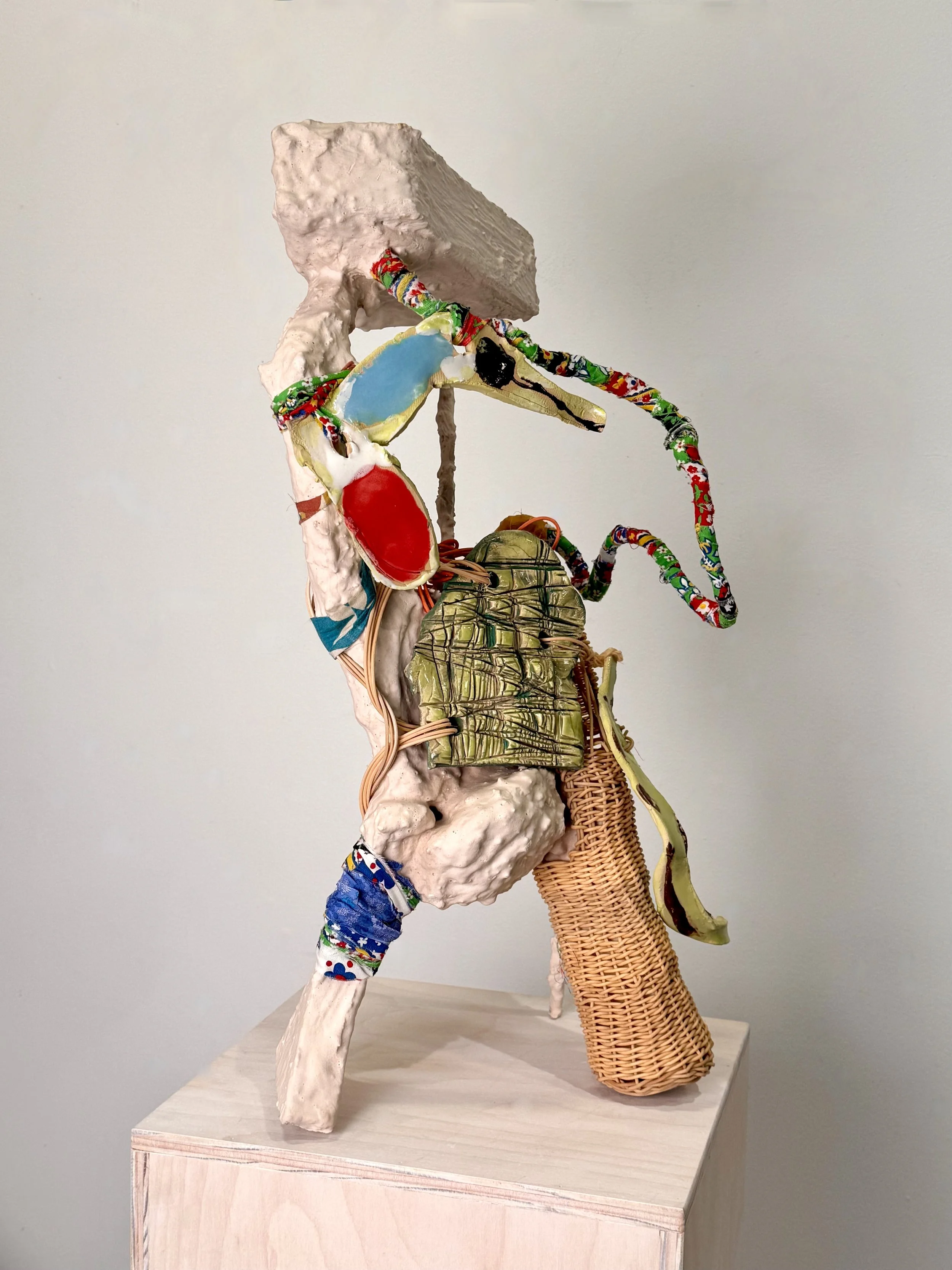 “Ways and Means”, 2025, 25” x 14” x 11” , Ceramic, fabric, wire, wood, paint.